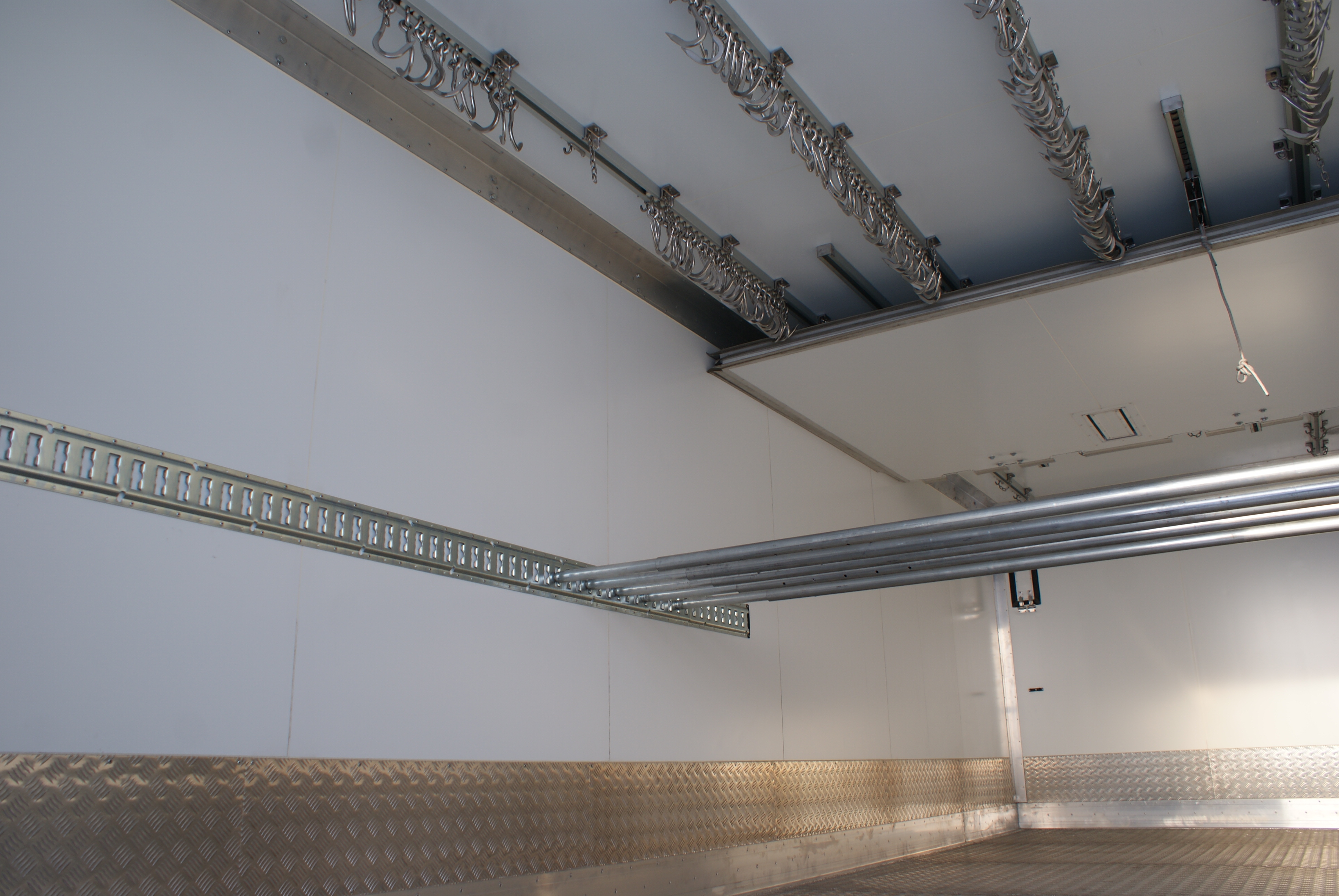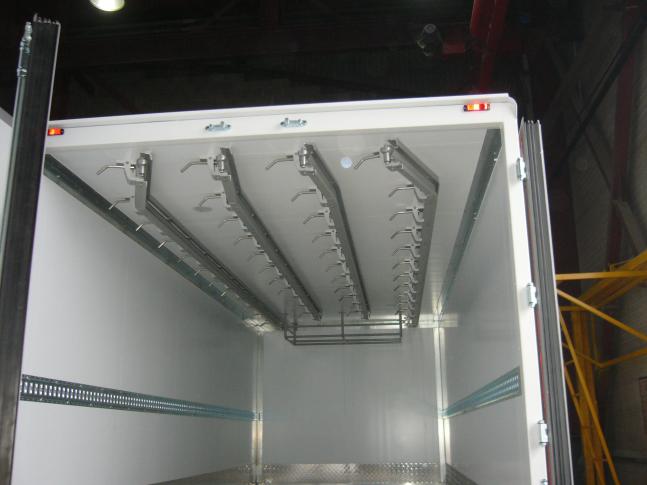 Внутренне оборудование фургона: система подвешивания крюков (направляющие) из нержавеющей стали. Держатели, концевики, фиксаторы импортного производства Pastore&Lombardi. Есть возможность альтернативного варианта подвеса с использованием профильных направляющих, что удешевляет стоимость фургона, но имеет ряд эксплуатационных ограничений - основной - отсутствие возможности подключения к транспортеру.