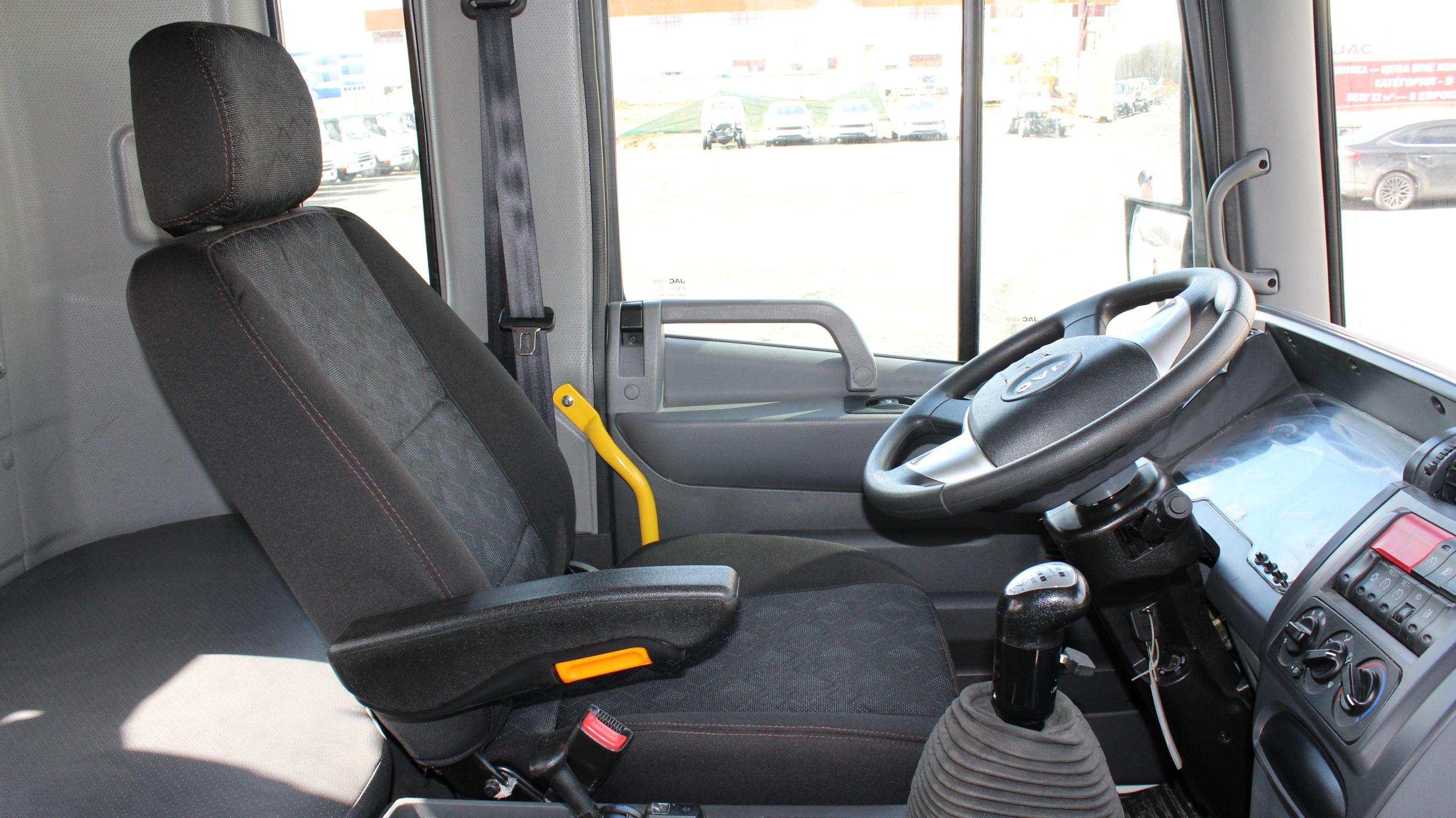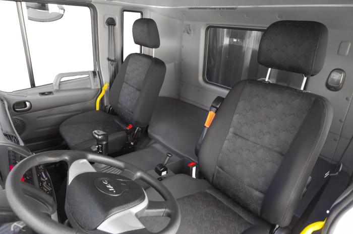 Кабина включает в себя сиденье с пневмоподвеской, рулевая колонка, регулируемая по наклону и по вылету, система круиз контроля, кондиционер, радиоприемник c USB.