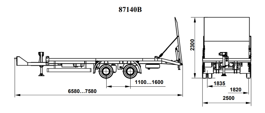 Грузоподъёмность прицепа модели 87140В - 8 тонн . Прицеп имеет грузовую платформу с бортами, возможна установка каркаса с тентом для защиты техники при транспортировке. Настил пола из рифленой стали . Данный прицеп, по индивидуальному заказу, может оснащаться гидрофицированным задним бортом , одновременно являющимся трапом для заезда техники. Оси оригинальной конструкции с двухскатными колесами. Подвеска всех колес зависимая , на пневматических упругих элементах. Технические характеристики прицепа модели 87140В. Прицеп предназначен, для транспортировки строительной и специальной техники по дорогам с твердым покрытием.
